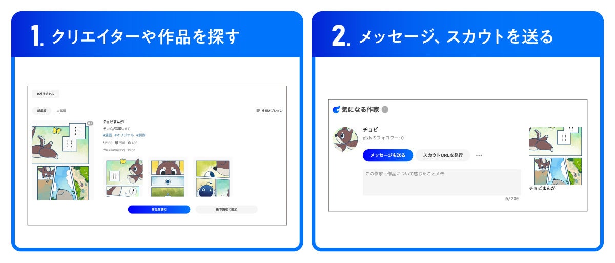 編集者の方は、サービスを通じてクリエイターへ「スカウト」を送信することができます。スカウトが受託されればクリエイターと直接連絡を取り合い、デビューに向けたやり取りを開始できます。pixivには年間18万作品ものオリジナルのマンガが投稿されますが、その中でもプロデビューを目指す熱量の高いクリエイターの作品を効率的に見つけることができます。