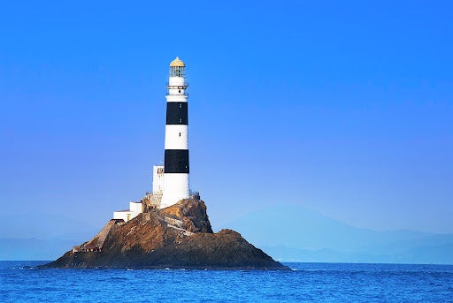 九州の大分県と四国の愛媛県を結ぶ豊後水道。その中間地点に浮かぶ水ノ子島に建つ、縞模様の灯台です。