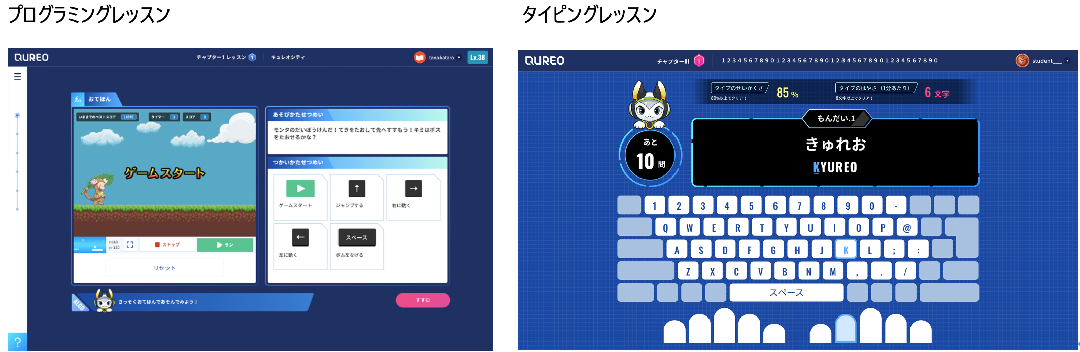 ミニゲームを作りながらプログラミングの基礎となる「順次実行」「繰り返し」を学ぶことができるプログラミングレッスンと、アルファベット入力、ローマ字のひらがな入力までを練習できるタイピングレッスンをお使いいただけます。