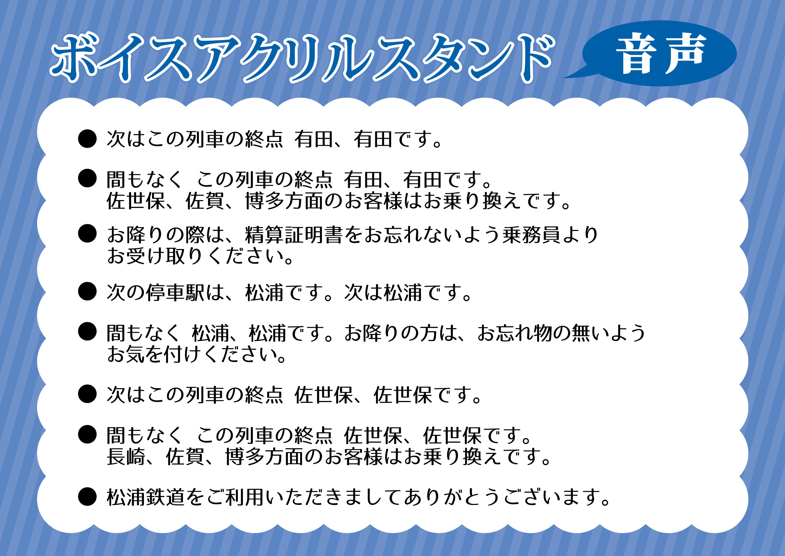 西浦ありさ(CV:安齋由香里)車内アナウンスボイスアクリルスタンド、ボイスラバーストラップ、駅間が短いことで有名な中佐世保⇔佐世保中央を表現した3連アクリルキーホルダーなど「西浦ありさ」の新作グッズ、さらにイベント開催記念として「光るパスケースPIICA(ピーカ)松浦鉄道版」も販売します!