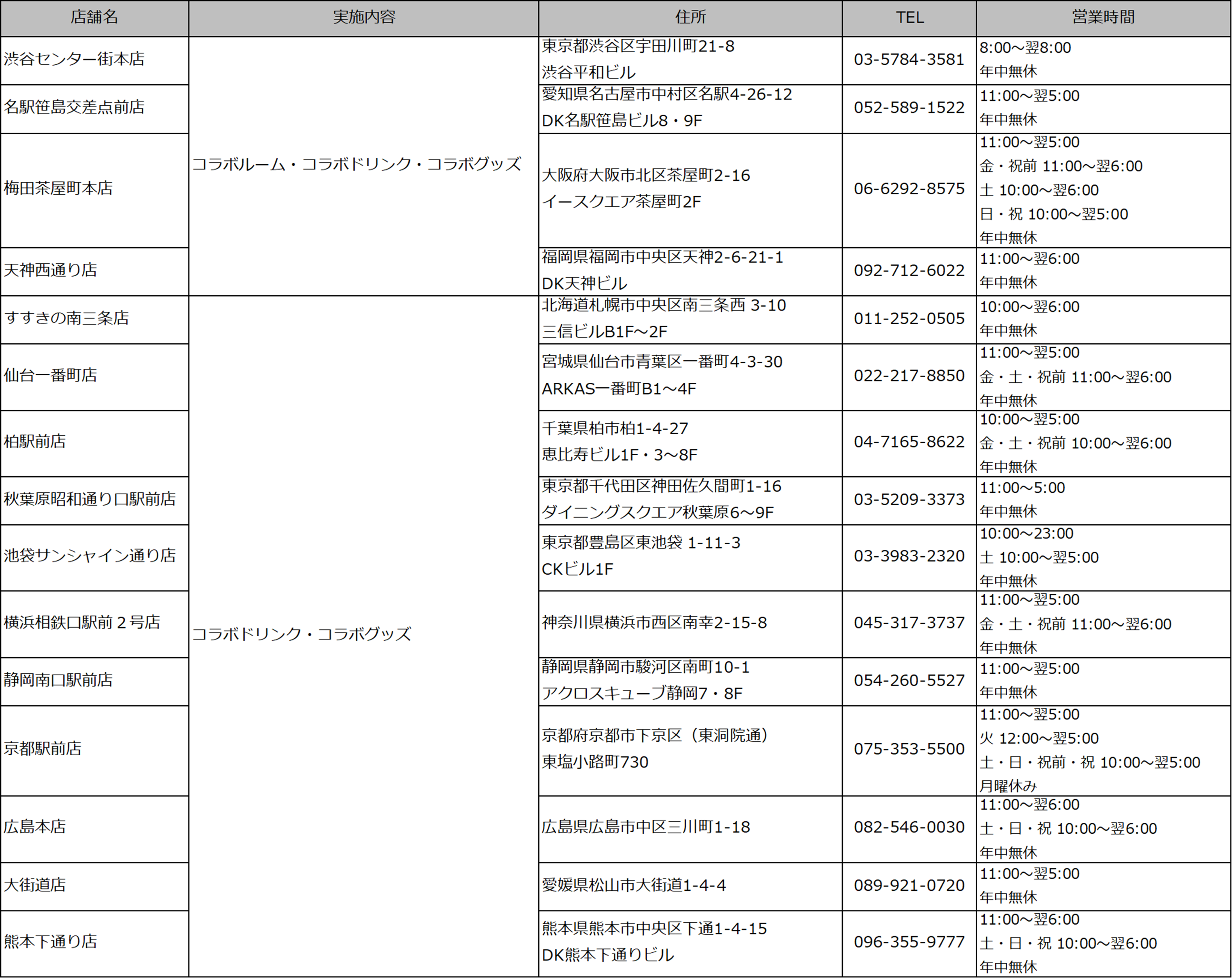 実施店舗(15店舗):すすきの南三条店、仙台一番町店、渋谷センター街本店、池袋サンシャイン通り店、秋葉原昭和通り口駅前店、横浜相鉄駅前2号店、柏駅前店、静岡南口駅前店、名駅笹島交差点前店、京都駅前店、梅田茶屋町本店、広島本店、大街道店、天神西通り店、熊本下通り店