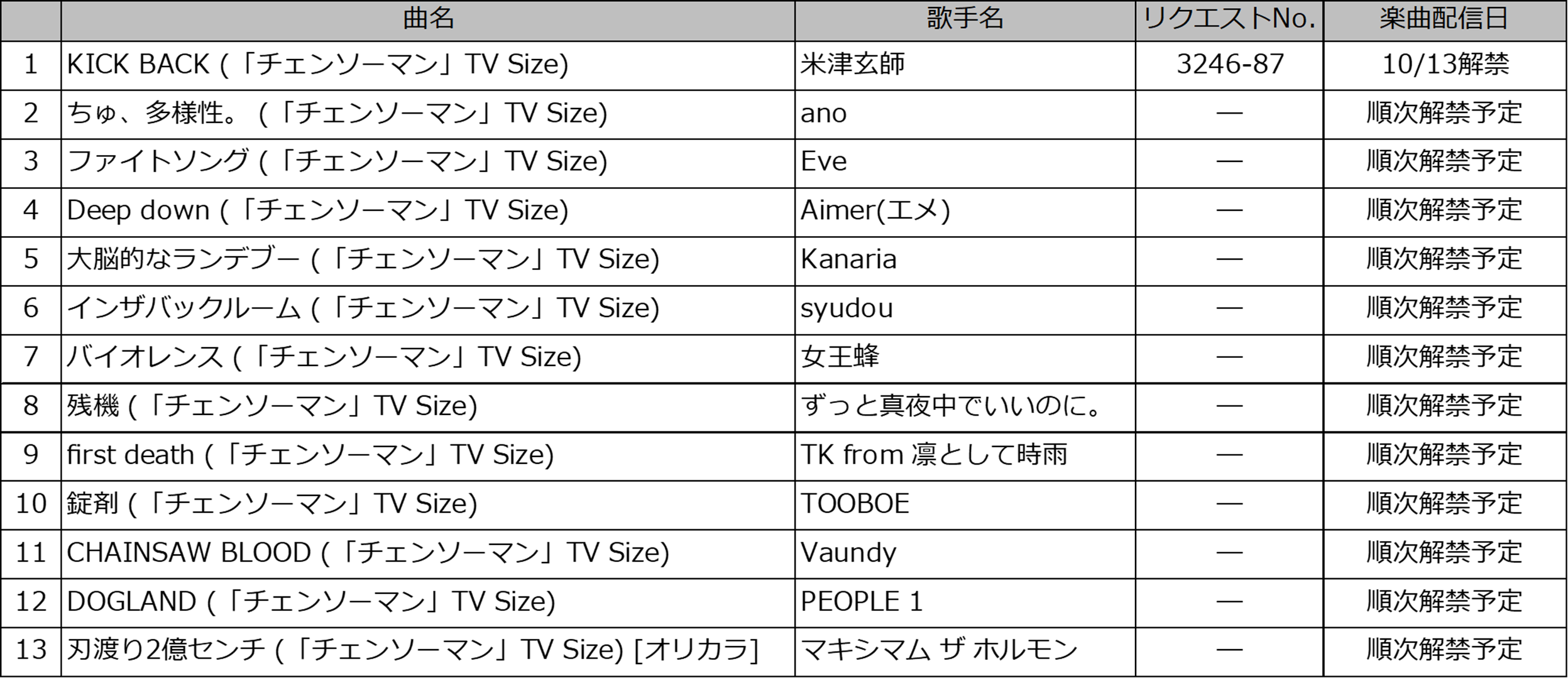 株式会社第一興商は、TVシリーズ『チェンソーマン』の放送開始を記念して、10月13日よりDAM独占で、テレビサイズカラオケの世界最速配信を開始、関連楽曲全13曲が順次お楽しみいただけます。また、アニメ映像も今後順次配信します。さらに、10月13日から全国のDAMとビッグエコーで、スペシャルなコラボキャンペーンを開始します。