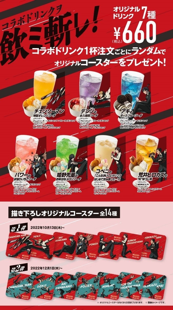 また、カラオケルームビッグエコーでは、15店舗においてコラボドリンクと限定グッズを販売します。うち4店舗では、作品の世界観を堪能できる描き下ろしイラストでラッピングしたコラボルームをご用意しました。コラボルーム内ではプロジェクター投影により特別待機映像をお楽しみいただけます。人気キャラをイメージしたコラボドリンクは、1杯のご注文ごとにオリジナルコースター全14種をランダムでプレゼントします。*