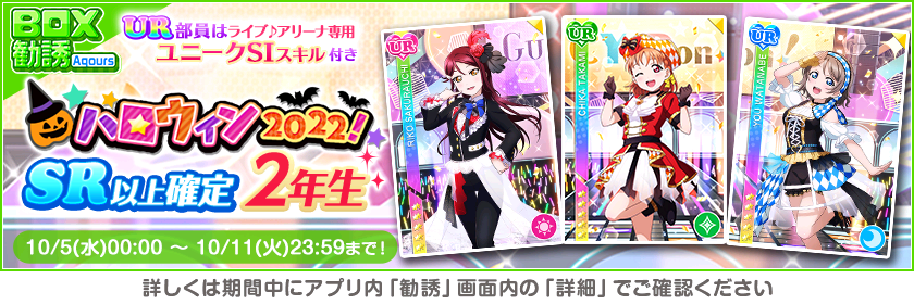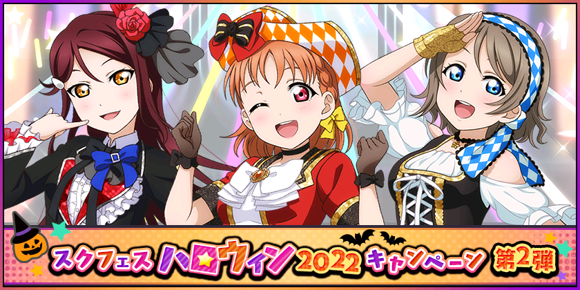 株式会社ブシロード(本社:東京都中野区、代表取締役社長:木谷高明)は、KLab株式会社(本社:東京都港区、代表取締役社長:森田英克)と共同開発いたしましたスマートフォン向けアプリ『ラブライブ!スクールアイドルフェスティバル』(以下、スクフェス) においてスクフェスハロウィン2022キャンペーン第2弾の開催をお知らせいたします。