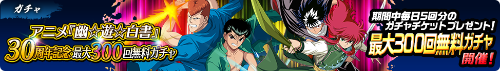 「アニメ『幽☆遊☆白書』30周年記念チケットログインボーナス第1弾」と「アニメ『幽☆遊☆白書』30周年記念チケットログインボーナス第2弾」で獲得したガチャチケットで、最大300回分無料で引けるガチャを開催。