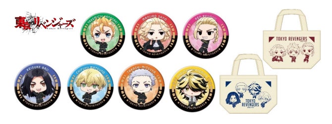 花垣武道(タケミチ)、佐野万次郎(マイキー)、龍宮寺堅(ドラケン)、場地圭介、松野千冬、三ツ谷隆、羽宮一虎のイラストがデザインされた缶バッジ・ミニバッグのアソート。価格:500円(税込)