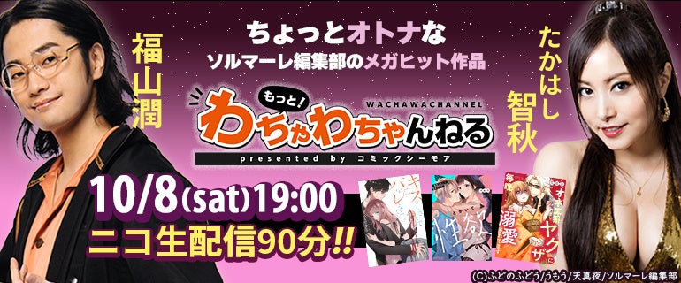 エヌ・ティ・ティ・ソルマーレ株式会社(本社:大阪市中央区、代表取締役社長:朝日利彰、以下NTTソルマーレ)が提供する国内最大級の電子書籍サイト「コミックシーモア」は、大好評配信中のマンガ愛溢れるYouTube番組「わちゃわちゃんねる」では聞けないもっとディープなマンガ愛を発信するニコニコ動画チャンネル「もっと!わちゃわちゃんねる」にて、2022年10月8日(土)に声優の福山潤さん、たかはし智秋さんが出演しオリジナルコミックメガヒット3作品を朗読する特別番組のライブ配信を決定しました。