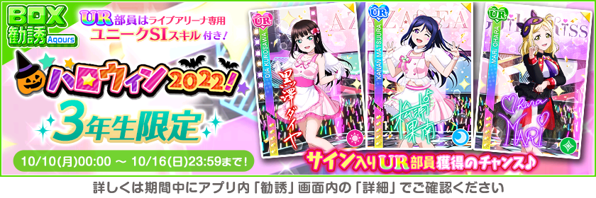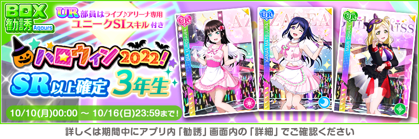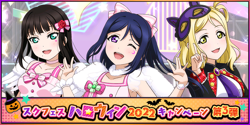 株式会社ブシロード(本社:東京都中野区、代表取締役社長:木谷高明)は、KLab株式会社(本社:東京都港区、代表取締役社長:森田英克)と共同開発いたしましたスマートフォン向けアプリ『ラブライブ!スクールアイドルフェスティバル』(以下、スクフェス) においてスクフェスハロウィン2022キャンペーン第3弾の開催をお知らせいたします。