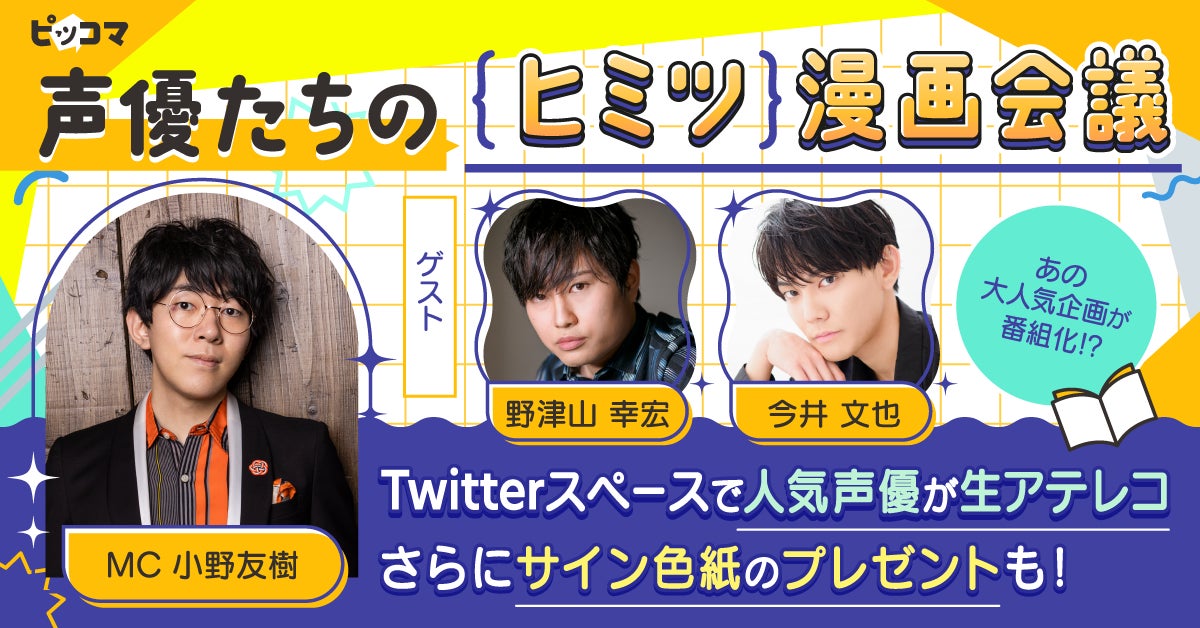 電子マンガ・ノベルサービス「ピッコマ」では、10/11(火)より、人気声優のマンガトークやSMARTOON®︎の生アテレコを楽しめる「声優たちのヒミツ漫画会議」を、ピッコマの公式Twitterスペースにてレギュラー番組化いたします。