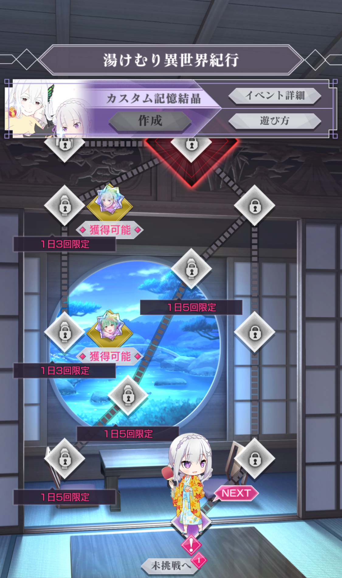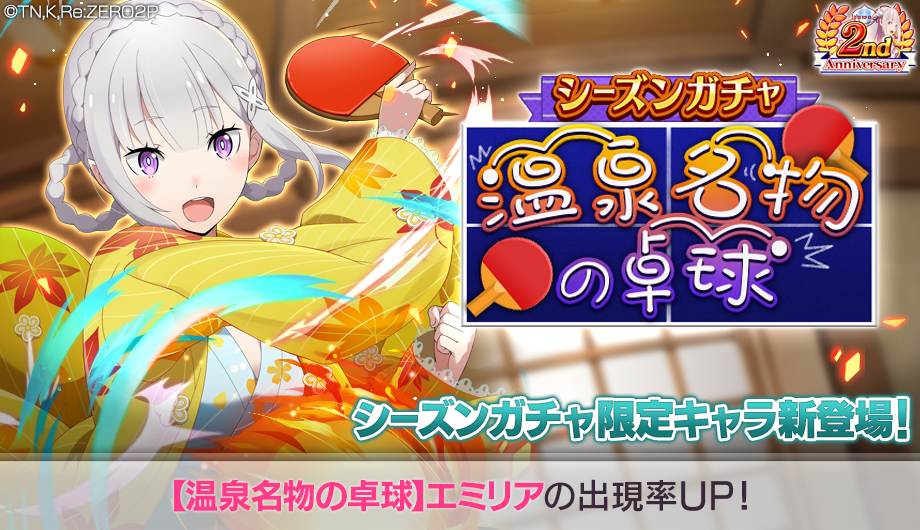 内容:踏破イベント「湯けむり異世界紀行」の特効を持ったキャラクター「【温泉名物の卓球】エミリア★3」、記憶結晶「ボッコの実の効能★3」の出現率がUPする「シーズンガチャ【温泉名物の卓球】」を開催します。