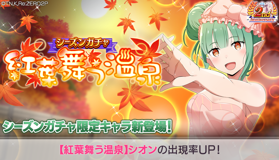 また、踏破イベント「湯けむり異世界紀行」の特効を持ったキャラクター「【温泉名物の卓球】エミリア★3」が新登場する「シーズンガチャ【温泉名物の卓球】」と、「【紅葉舞う温泉】シオン★3」が新登場する「シーズンガチャ【紅葉舞う温泉】」を同日より開催します。