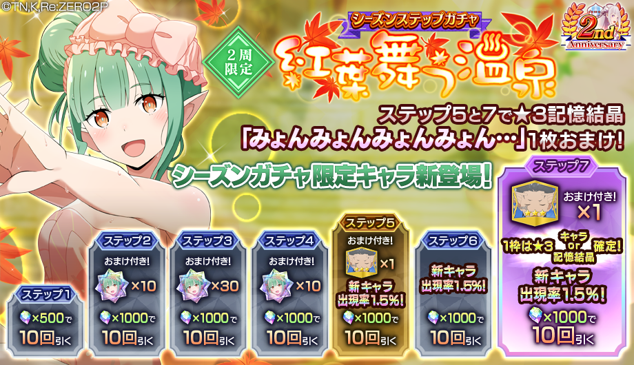 内容:期間中、2周限定で引くことができる、「シーズンステップガチャ【紅葉舞う温泉】」を開催します。