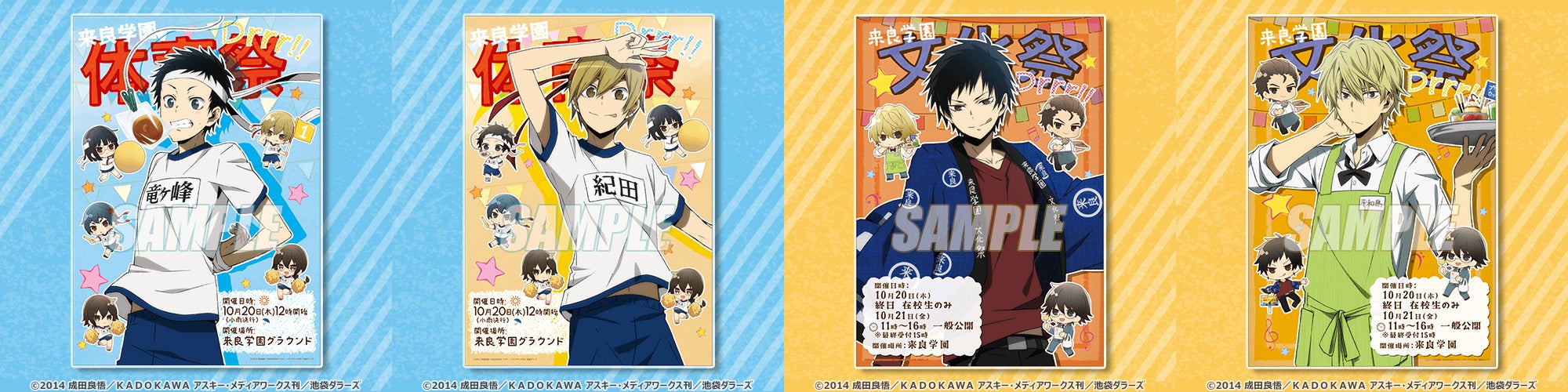 オンラインくじは、体育祭をテーマとした帝人・正臣の描き下ろしイラストをメインとする「体育祭くじ」と、文化祭をテーマとした臨也・静雄の描き下ろしをメインとする「文化祭くじ」の2つです。飾るとお部屋が華やかになるタペストリーやアクリルスタンドフィギュアに加え、それぞれのイベントを盛り上げるポスターも登場します! また10連購入で、「原作者・成田良悟先生書き下ろしSSリーフレット」や「ハート型缶バッジ」がもらえるキャンペーンも実施します。お見逃しなく!