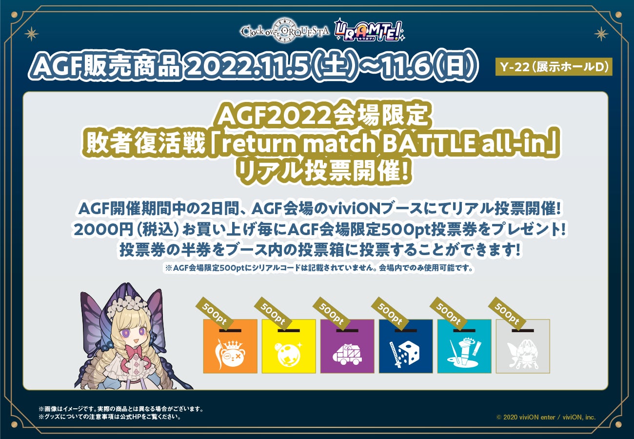 ※ AGF2022におけるグッズ販売、及び投票券についての注意事項がございます。詳しくは公式サイト( https://clockoverorquesta.com/news/2491/ )をご確認ください。