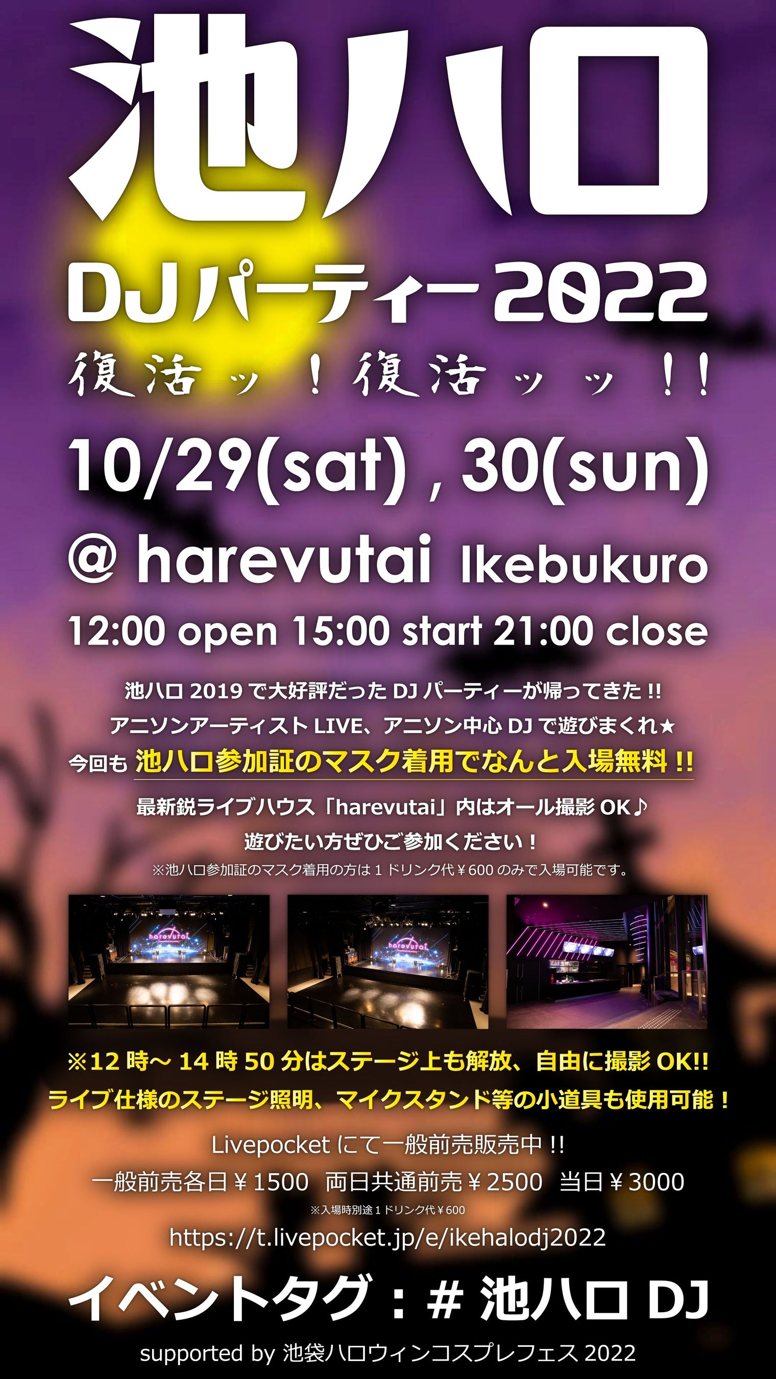 2019年に開催し大好評だった「池ハロDJパーティー」を3年ぶりに開催。アニソン中心のDJやアニソンアーティストのライブを楽しめるほか、ライブ仕様の会場照明とマイクスタンドを使用したコスプレ撮影も楽しめます。