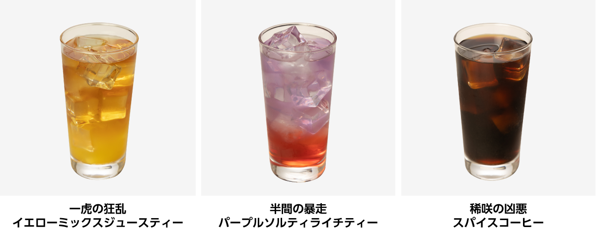 半間をイメージしたフルーツティーです。半間のイメージカラーである紫色のバタフライピーティーにソルティライチとエナジードリンクを加え、誰にも止められない半間を表現しています。