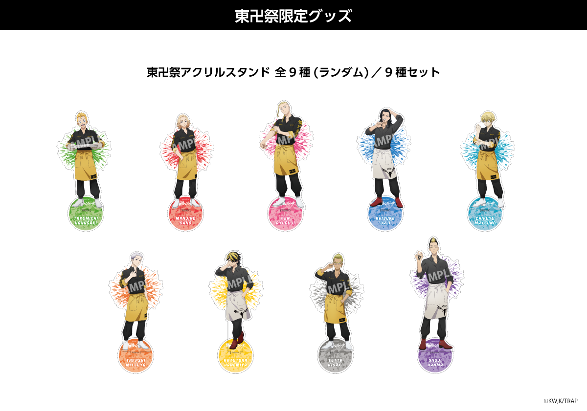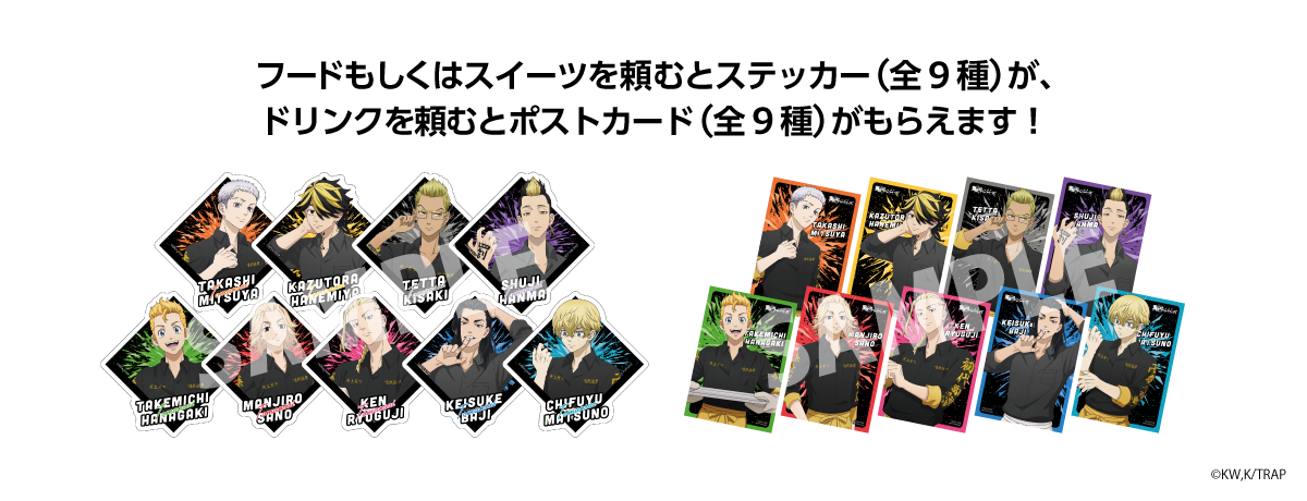 マイキーとドラケンの最強タッグ、三ツ谷が武道のために仕立てた特攻服など、キャラクター達の関係性を表現したオリジナルメニューの美味しさにノックアウトされること間違いなし!東京卍會と芭流覇羅の幹部メンバー達が、特攻服をイメージしたカフェの制服に身を包み、お客様を出迎える描き下ろしイラストを使用した限定グッズも多数登場します。前回以上にこだわりの詰まった「東卍祭 vol.2」を是非お楽しみください。