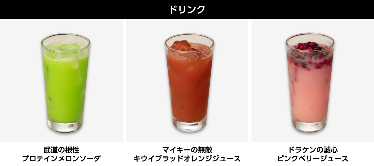 武道をイメージしたメロンソーダです。武道のイメージカラーである緑色のメロンソーダにプロテインドリンクを加え、何度やられても立ち上がるタフな武道を表現しています。
