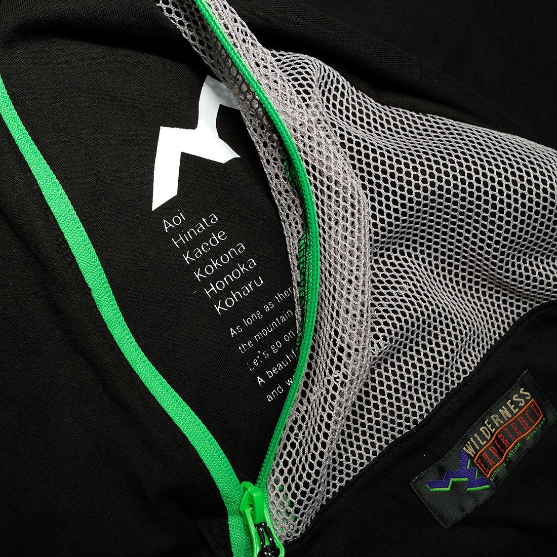 『そこに山があるから 山ガールたちは挑み続ける。さあ、でかけよう。素敵な景色が待っているから。そして、いつかたどりつくんだ。』ディザーPVのコピーとキャラクター名が英文でメッシュが施されたテントポケット内にプリントされています。