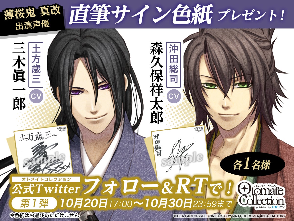 株式会社NTTドコモ(本社:東京都千代田区、代表取締役社長:井伊基之、以下 NTTドコモ)は、2022年10月20日(木)から3か月連続で、自社が運営するサブスクリプションサービス「オトメイトコレクション」の公式Twitterアカウント(@otomate_colle)をフォロー&対象ツイートをリツイートしていただいた方の中から「薄桜鬼 真改」出演声優の直筆サイン色紙が抽選で当たるキャンペーンを開催します。キャンペーンは期間中に3回に分けて行われ、2022年10月20日(木)から2022年10月30日(日)まで行われる第1弾では三木眞一郎様と森久保祥太郎様の直筆サイン色紙を抽選で各1名様にプレゼントいたします。
