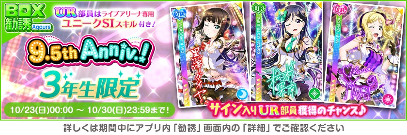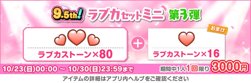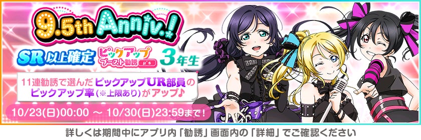 株式会社ブシロード(本社:東京都中野区、代表取締役社長:木谷高明)は、KLab株式会社(本社:東京都港区、代表取締役社長:森田英克)と共同開発いたしましたスマートフォン向けアプリ『ラブライブ!スクールアイドルフェスティバル』(以下、スクフェス) においてスクフェス9.5thAnniversaryキャンペーン第3弾の開催をお知らせいたします。