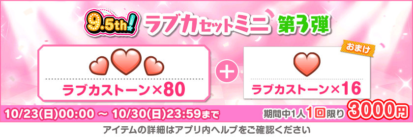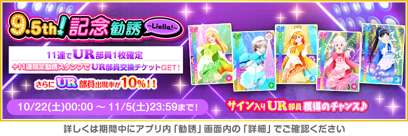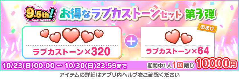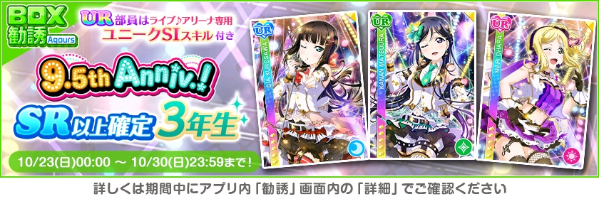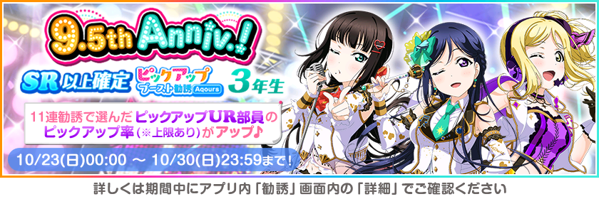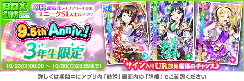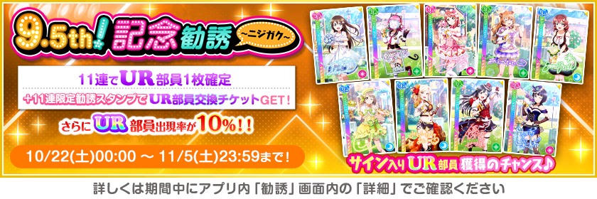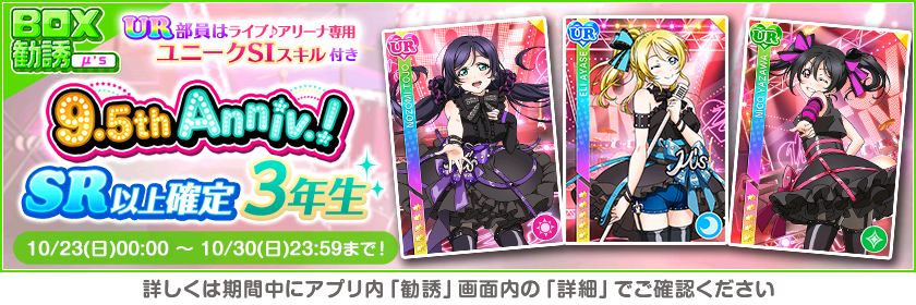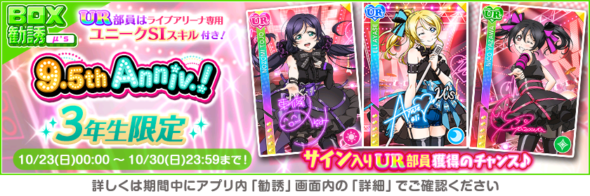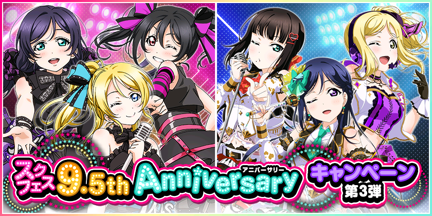 株式会社ブシロード(本社:東京都中野区、代表取締役社長:木谷高明)は、KLab株式会社(本社:東京都港区、代表取締役社長:森田英克)と共同開発いたしましたスマートフォン向けアプリ『ラブライブ!スクールアイドルフェスティバル』(以下、スクフェス) においてスクフェス9.5thAnniversaryキャンペーン第3弾の開催をお知らせいたします。