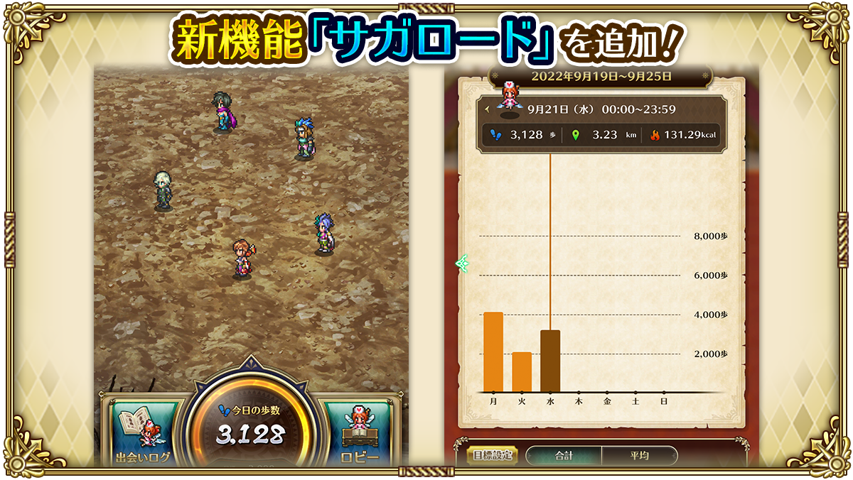 たくさん歩いてほかのキャラクターと出会ったり、サガの各地をめぐったり、より身近にサガを感じられる機能となっています。詳細はゲーム内の「サガロード」をご覧ください。