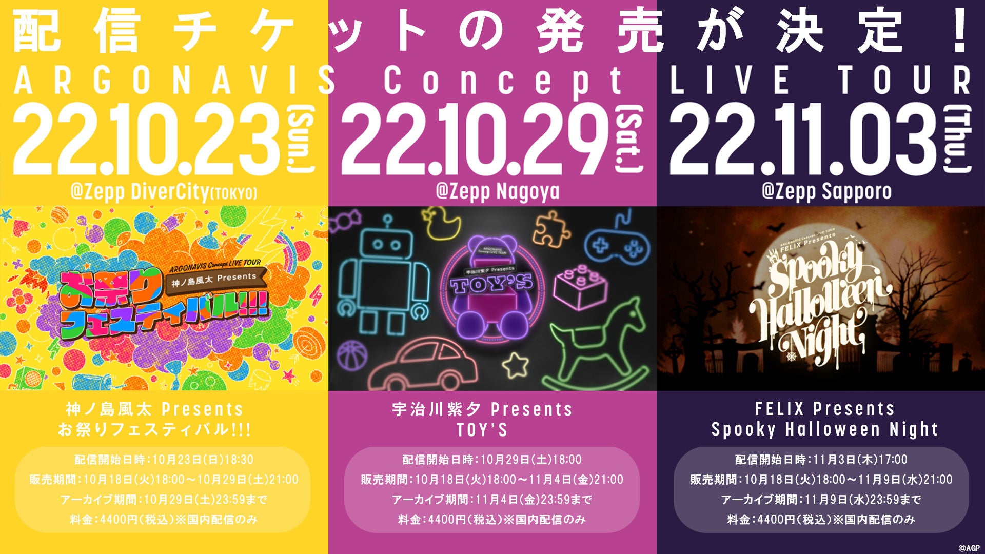 株式会社ブシロード(本社:東京都中野区、代表取締役社長:木谷高明)のグループ会社にあたる株式会社アルゴナビス(本社:東京都中野区、代表取締役社長:木谷高明)は、「ARGONAVIS Concept LIVE TOUR 神ノ島風太 Presents お祭りフェスティバル!!!」についてご報告いたします。