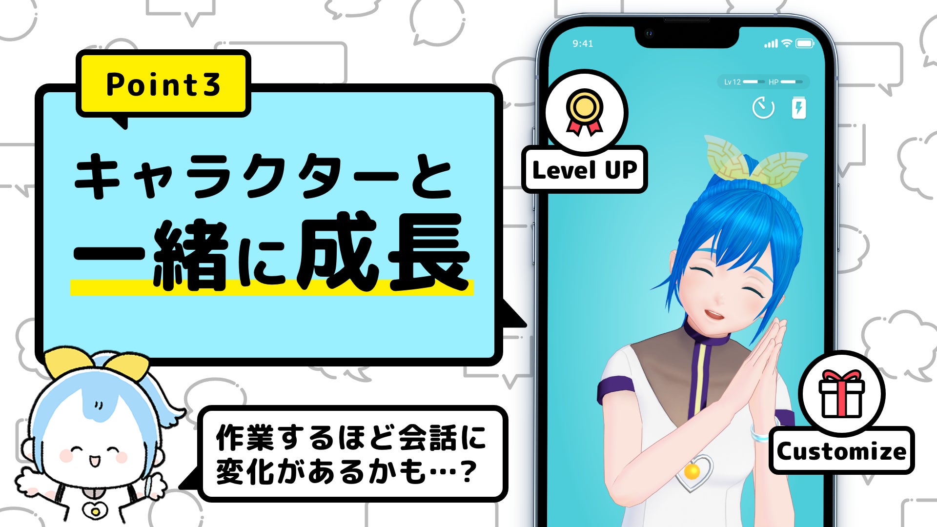 作業を継続するほどキャラクターのレベルが上がったり、キャラクターが作ったアイテムで見た目をカスタマイズすることができます。いつもの作業を続けるだけで、あなた自身の成長と共にキャラクターも一緒に成長していきます。