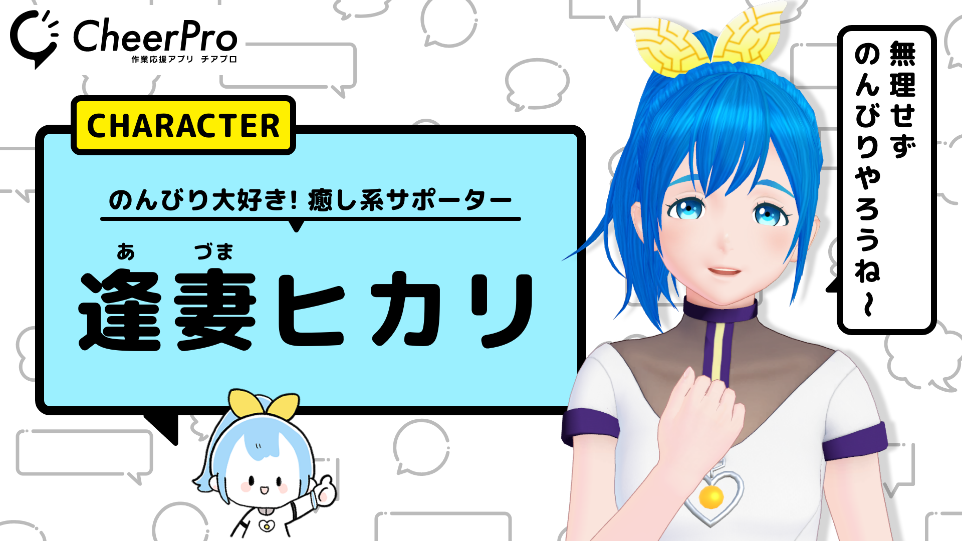 最初のキャラクターとして癒し系サポーター「逢妻ヒカリ」が登場し、おうちで作業している皆様の疲れを癒します。