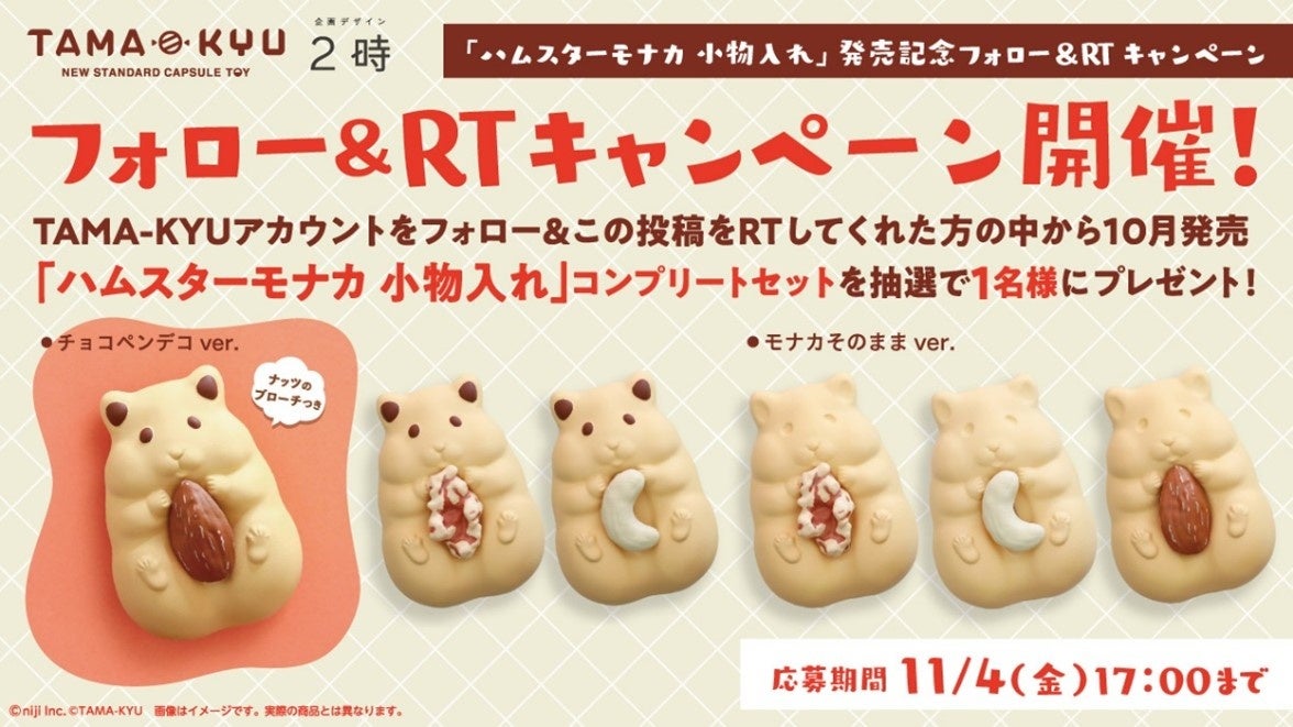『TAMA-KYU(タマキュー)』公式Twitterにて、「ハムスターモナカ 小物入れ」全種セットが当たるキャンペーンを実施中!