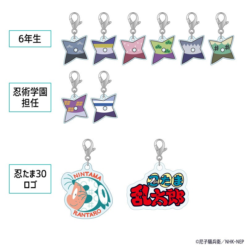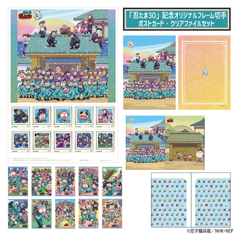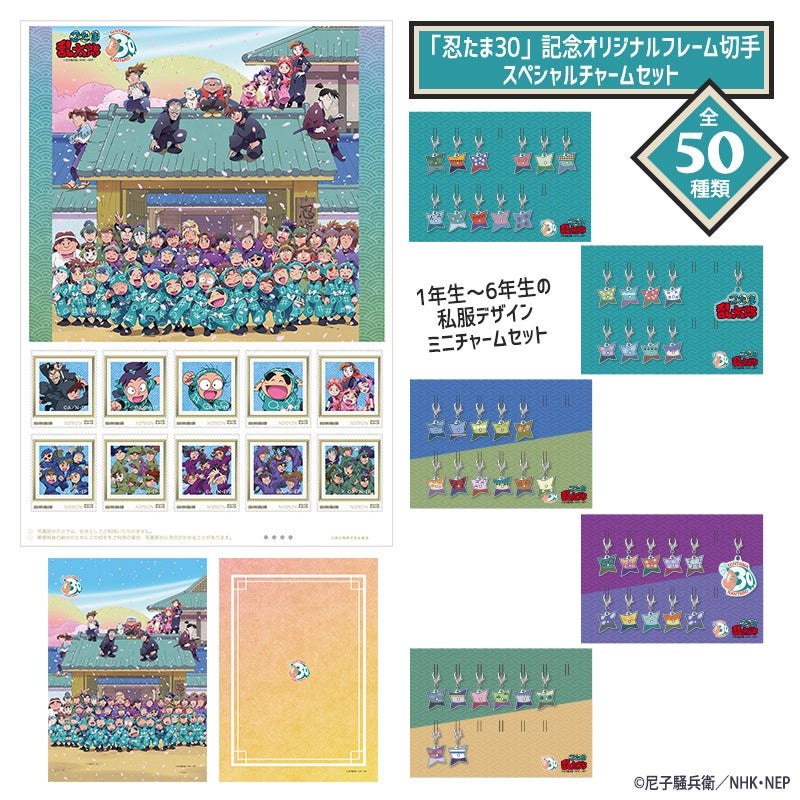 今回発売される『「忍たま30」記念オリジナルフレーム切手セット』は、シンプルな切手セットの他、歴代ポスターアートを使用したオリジナルポストカードと「忍たま30」のキービジュアルを使用したWクリアファイルのセット、また超豪華版として全忍たまの私服デザインを描き起こした50種類のアクリルチャームのスペシャルセットをご用意しました。