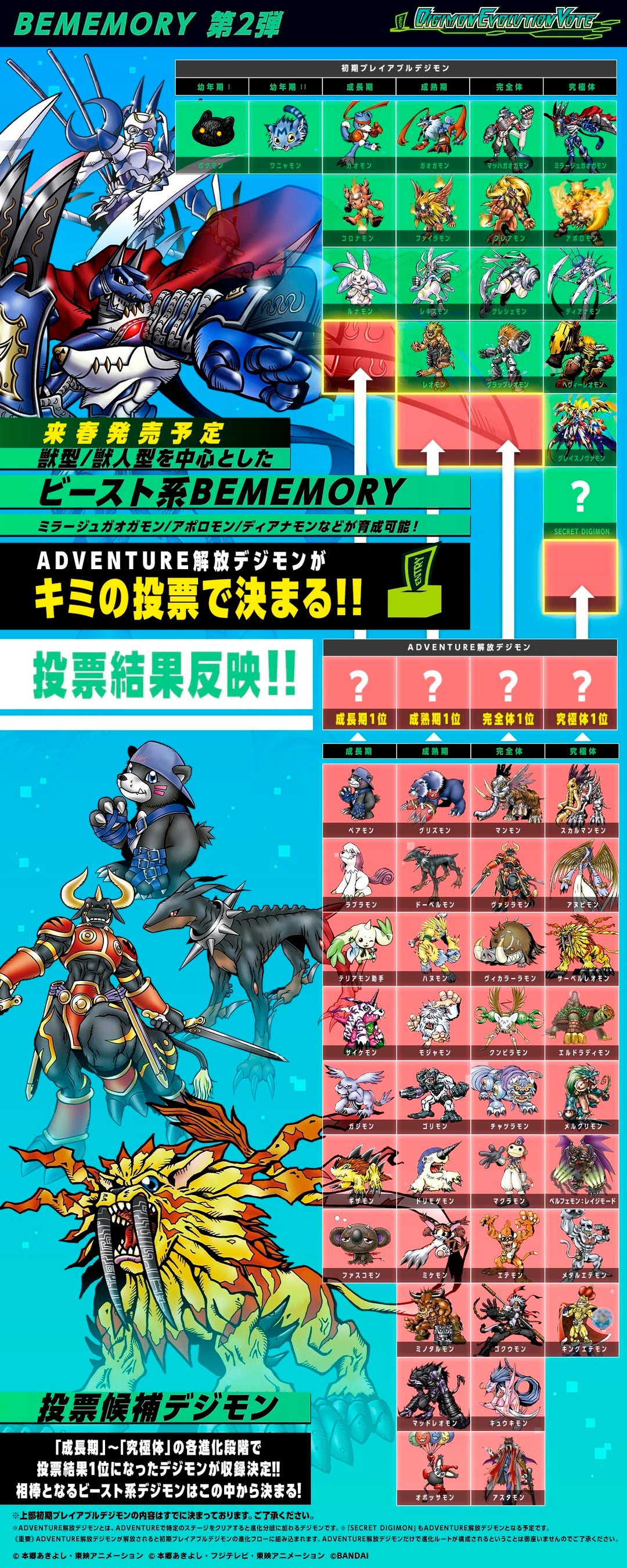 ※「デジ民投票」ページは、2022年11月1日16時に「DIGIMON EVOLUTION VOTE 第1弾:ドラゴン系BEMEMORY 」、2022年11月15日16時に「DIGIMON EVOLUTION VOTE 第2弾、ビースト系BEMEMORY 」の内容へと切り替わります。