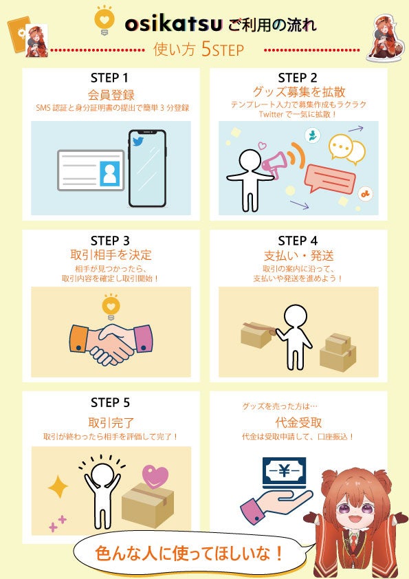 osikatsu(オシカツ)とは、「あなたの推し活動を豊かにする」というコンセプトのもと、“すぐに、簡単に、安全に”推しグッズの譲渡・交換・買取が、安心・安全にできる会員制のグッズ取引サイトです。