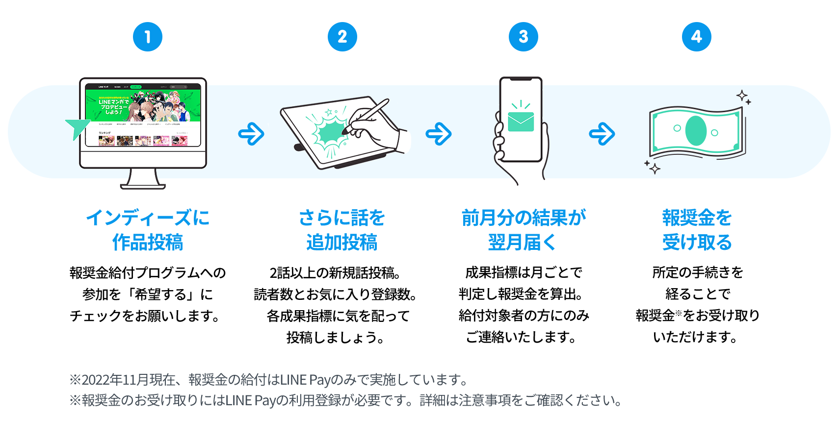 LINE Digital Frontier株式会社 (本社:東京都新宿区、代表取締役:金信培(キム・シンベ)/髙橋将峰) は、当社が運営する電子コミックサービス「LINEマンガ」https://manga.line.me/ において、マンガ業界の未来を創るクリエイターの皆様が持続的に収益を得られる新しいサポートの仕組み「LINEマンガ インディーズ 報奨金給付プログラム(βテスト)」を、本日11月1日(火)から開始します。