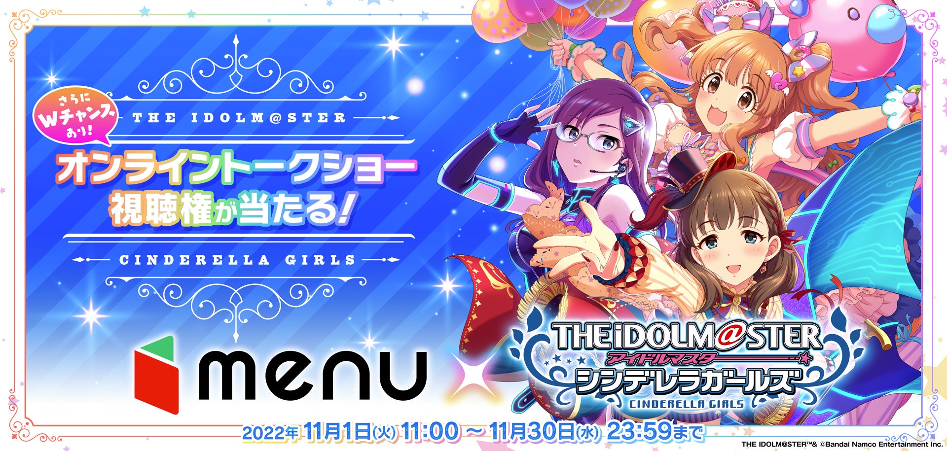この度menuでは、「アイドルマスター シンデレラガールズ」の「THE IDOLM@STER CINDERELLA GIRLS Twinkle LIVE Constellation Gradation」の開催を記念して、コラボキャンペーンを2022年11月1日(火)~2022年11月30日(水)の期間で開催いたします。本キャンペーンにご参加いただいた方の中から抽選で、オンライン配信イベントの視聴権と、menu描き起こしオリジナルミニキャラクターデザインのポストカードをプレゼント。その他、声優キャストサイン入りグッズが当たる他、応募者全員にmenuオリジナルの待ち受け画面をプレゼントいたします。