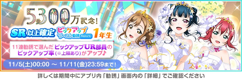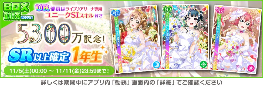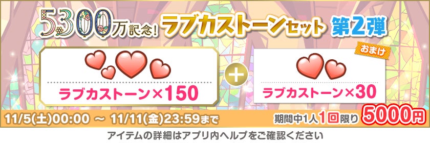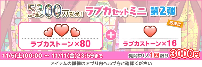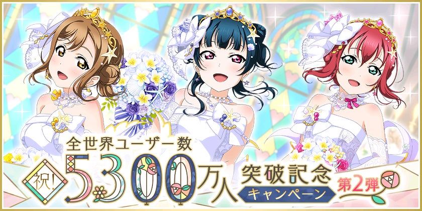 株式会社ブシロード(本社:東京都中野区、代表取締役社長:木谷高明)は、KLab株式会社(本社:東京都港区、代表取締役社長:森田英克)と共同開発いたしましたスマートフォン向けアプリ『ラブライブ!スクールアイドルフェスティバル』(以下、スクフェス) において祝!全世界ユーザー数5300万人突破記念キャンペーン第2弾の開催をお知らせいたします。