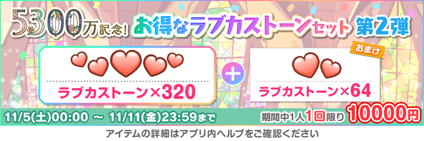 株式会社ブシロード(本社:東京都中野区、代表取締役社長:木谷高明)は、KLab株式会社(本社:東京都港区、代表取締役社長:森田英克)と共同開発いたしましたスマートフォン向けアプリ『ラブライブ!スクールアイドルフェスティバル』(以下、スクフェス) において祝!全世界ユーザー数5300万人突破記念キャンペーン第2弾の開催をお知らせいたします。