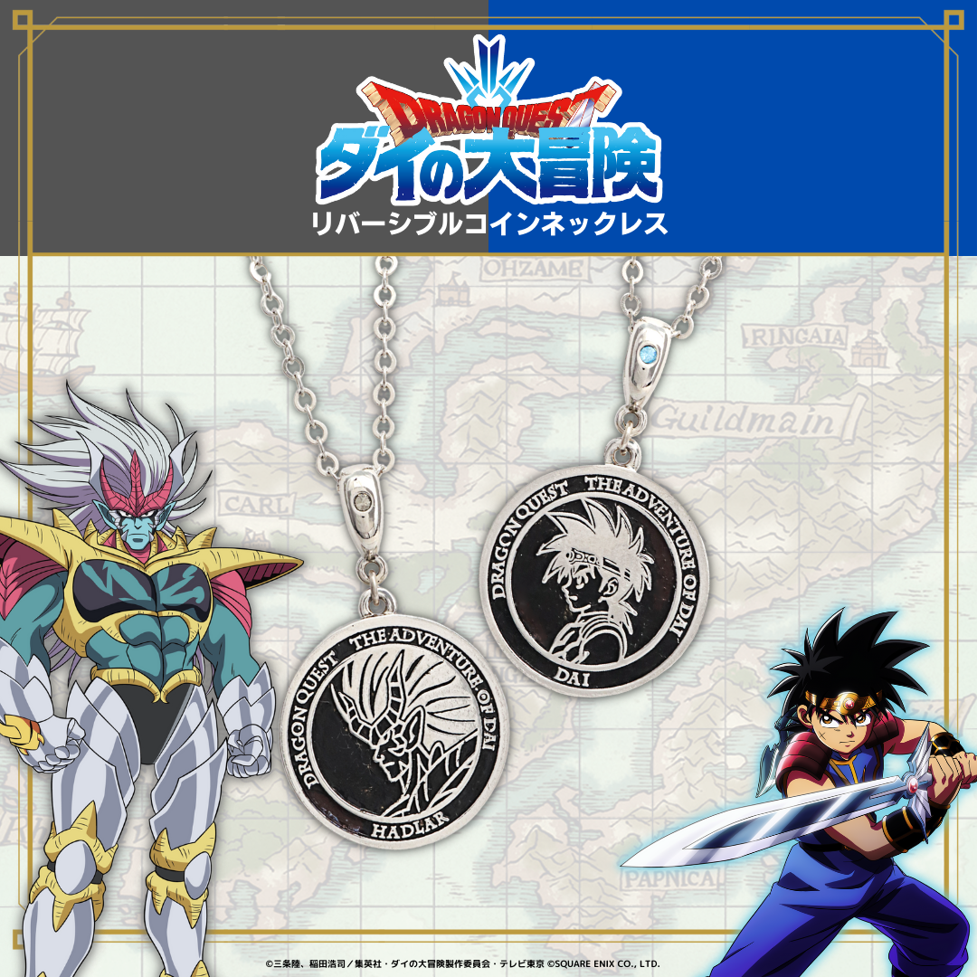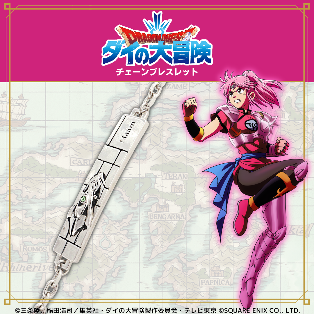 TVアニメ「ドラゴンクエスト ダイの大冒険」をイメージしたメモリアルアクセサリーは、ネックレス1種とブレスレット5種の全6種をラインナップしています。