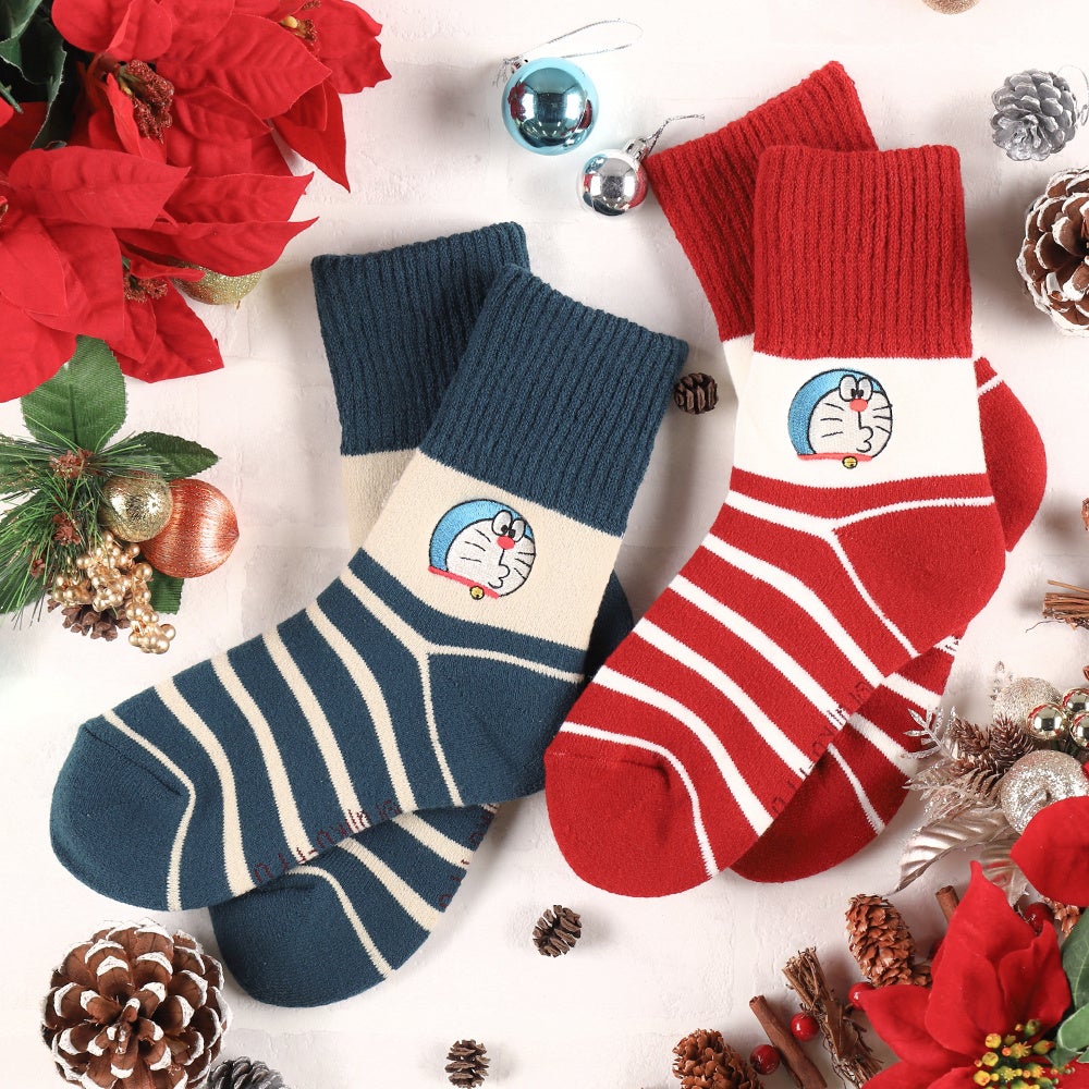 商品名:ドラえもん ボーダー裏ボアソックス レッド / グリーン