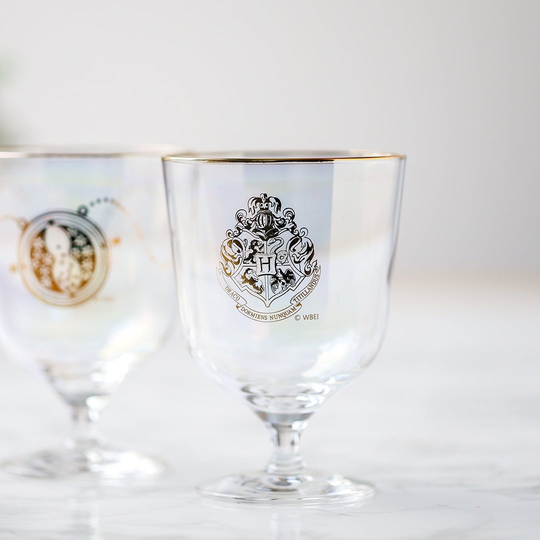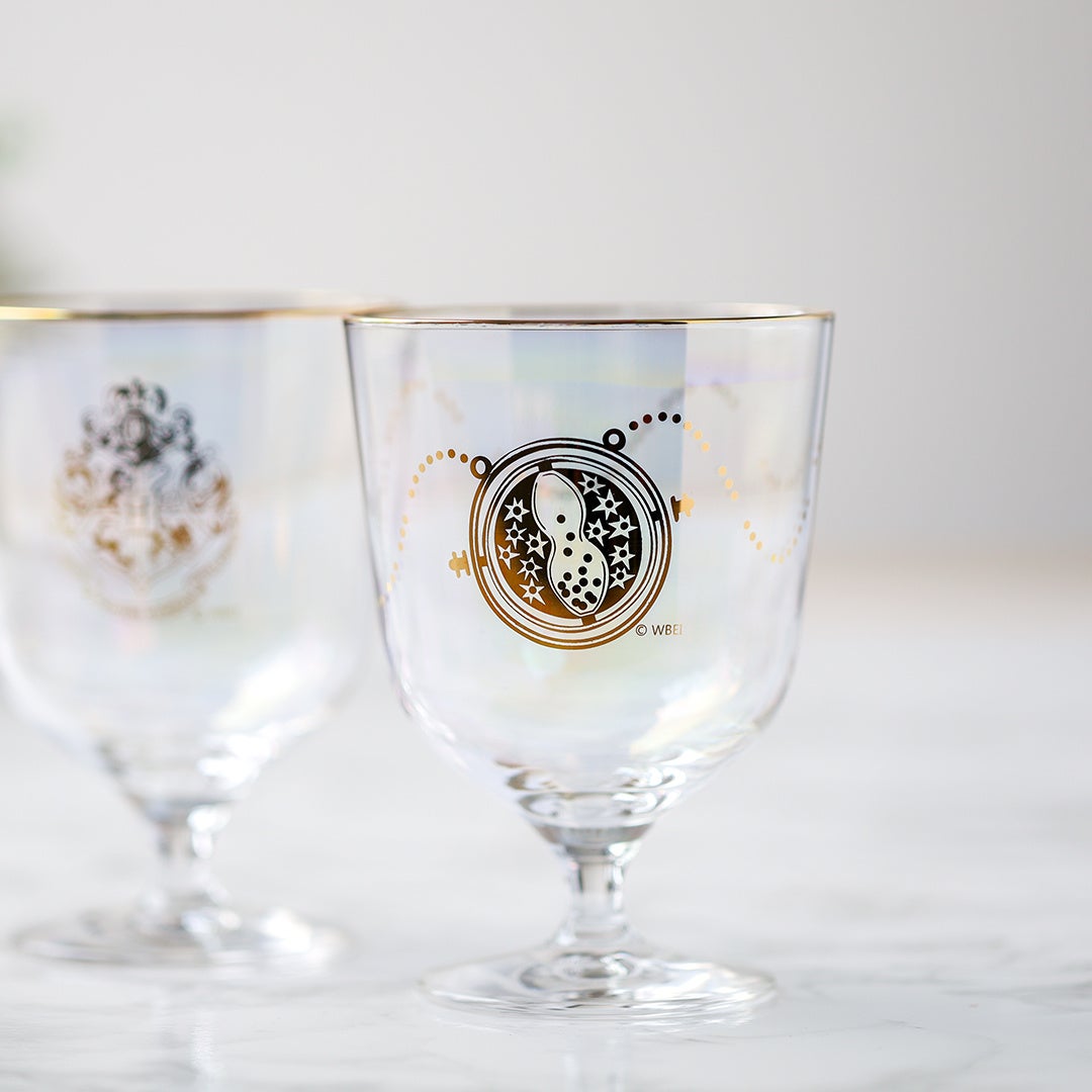 きらきらと上品な虹色に輝くオーロラゴブレットは、タイムターナーとホグワーツエンブレムのデザインの2個セットで、日々の暮らしに魔法を感じられるようなアイテムです。もちろん特別な日にご使用いただくのもおすすめです。箱入りの本商品はギフトにもぴったりです。