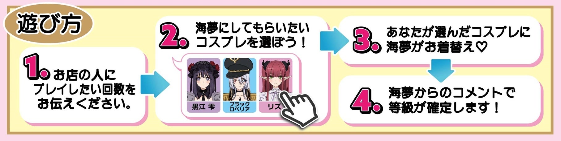 本催事では同イラストを使用したオリジナルグッズの販売のほか、結果に応じて景品が当たる外れ無しのミニゲーム「次のコスプレ何にする?」を実施いたします。