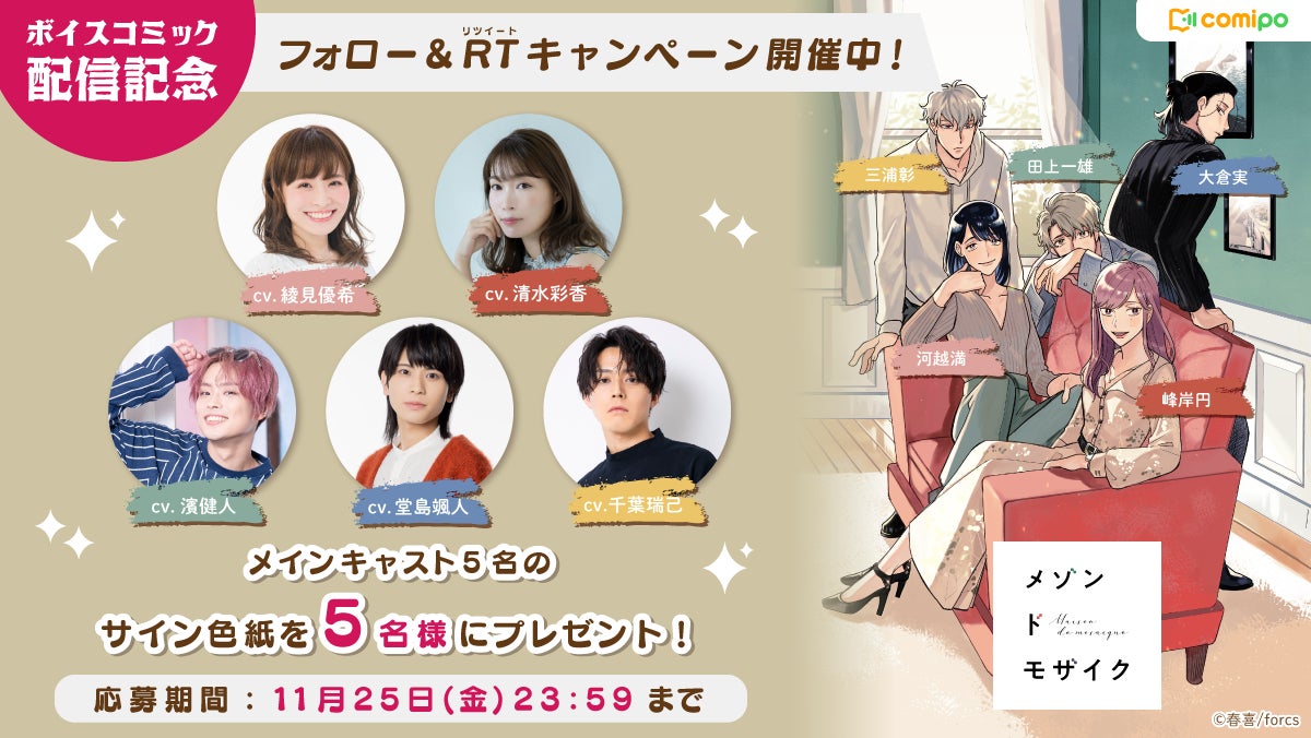 『メゾンドモザイク』のボイスコミック配信を記念して、清水彩香さん 、綾見優希さん、千葉瑞己さん、濱健人さん、堂島颯人さんのサイン色紙が当たるフォロー&RTキャンペーンを開催します。