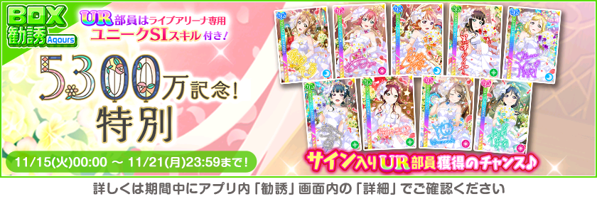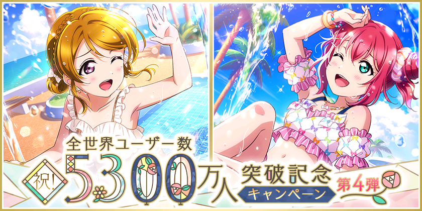 株式会社ブシロード(本社:東京都中野区、代表取締役社長:木谷高明)は、KLab株式会社(本社:東京都港区、代表取締役社長:森田英克)と共同開発いたしましたスマートフォン向けアプリ『ラブライブ!スクールアイドルフェスティバル』(以下、スクフェス) において祝!全世界ユーザー数5300万人突破記念キャンペーン第4弾の開催をお知らせいたします。