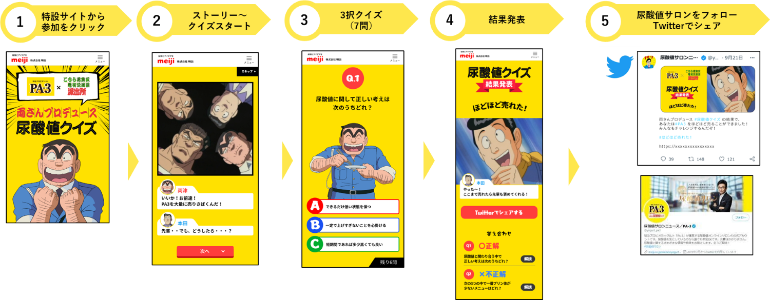 大量の「PA-3」を売りたい両さんが、尿酸値や商品について学べるクイズを企画!クイズは全7問。正解数に応じてランクが付き、両さんの「PA-3」販売量が変化します。果たして両さんは「PA-3」をいくつ売れるのか?販売数No.1を目指してクイズにご参加ください。