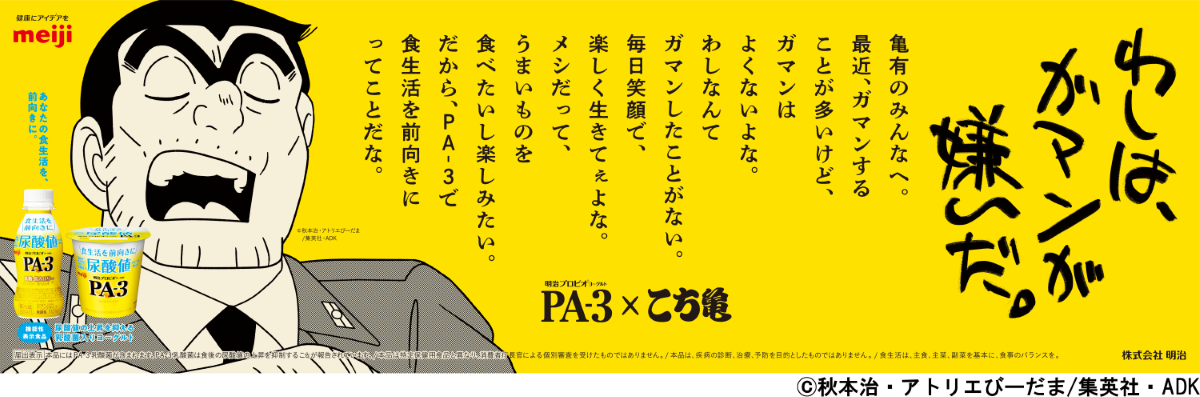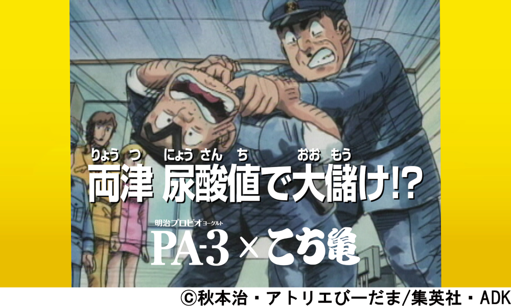 株式会社 明治(本社:東京都中央区、代表取締役社長:松田 克也)は、いつも頭の片隅に「尿酸値」の3字が引っ掛かっている方々の前向きな食生活を応援するため、「明治プロビオヨーグルトPA-3」と、大人気コミック『こちら葛飾区亀有公園前派出所』を原作とするアニメ“こち亀”のコラボキャンペーンを、本日11月14日(月)より開始します。