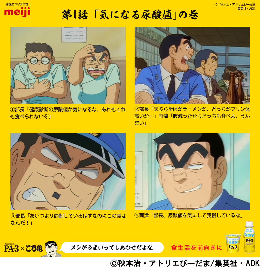 このたびのコラボは、両津勘吉(以下、両さん)が、たまたま飲み屋で出会った株式会社 明治の社員である、明治(アケオサム・45才)から、担当する尿酸値対策ヨーグルト「明治プロビオヨーグルトPA-3」の売り方について悩みを打ち明けられたことから始まります。両さんの上司、大原部長も尿酸値を気にして「食事がつまらない」と悩んでいたことから、「あの明治からご褒美がもらえるチャンス!」と両さんは閃き、尿酸値に悩む人の食生活を応援する様々な施策を捻り出します。