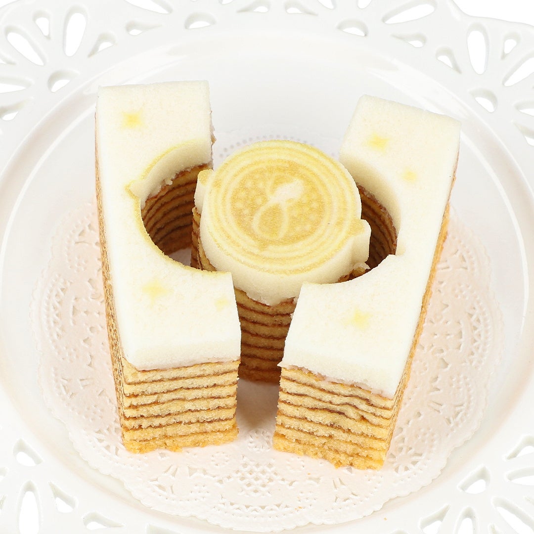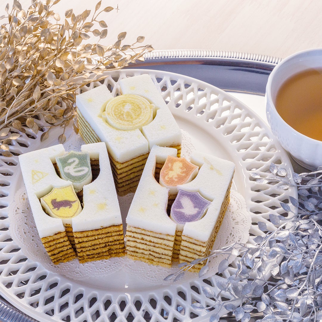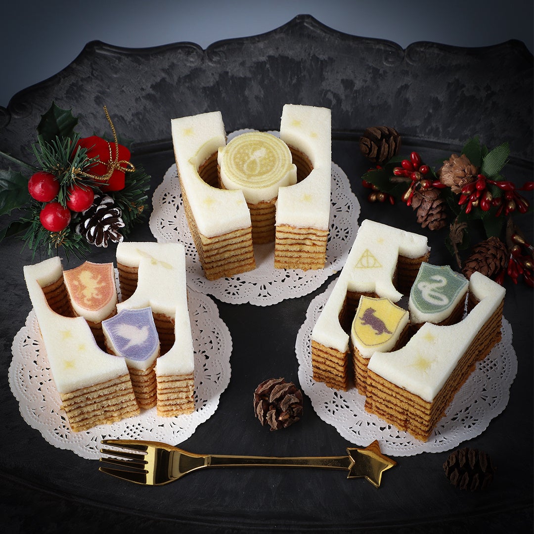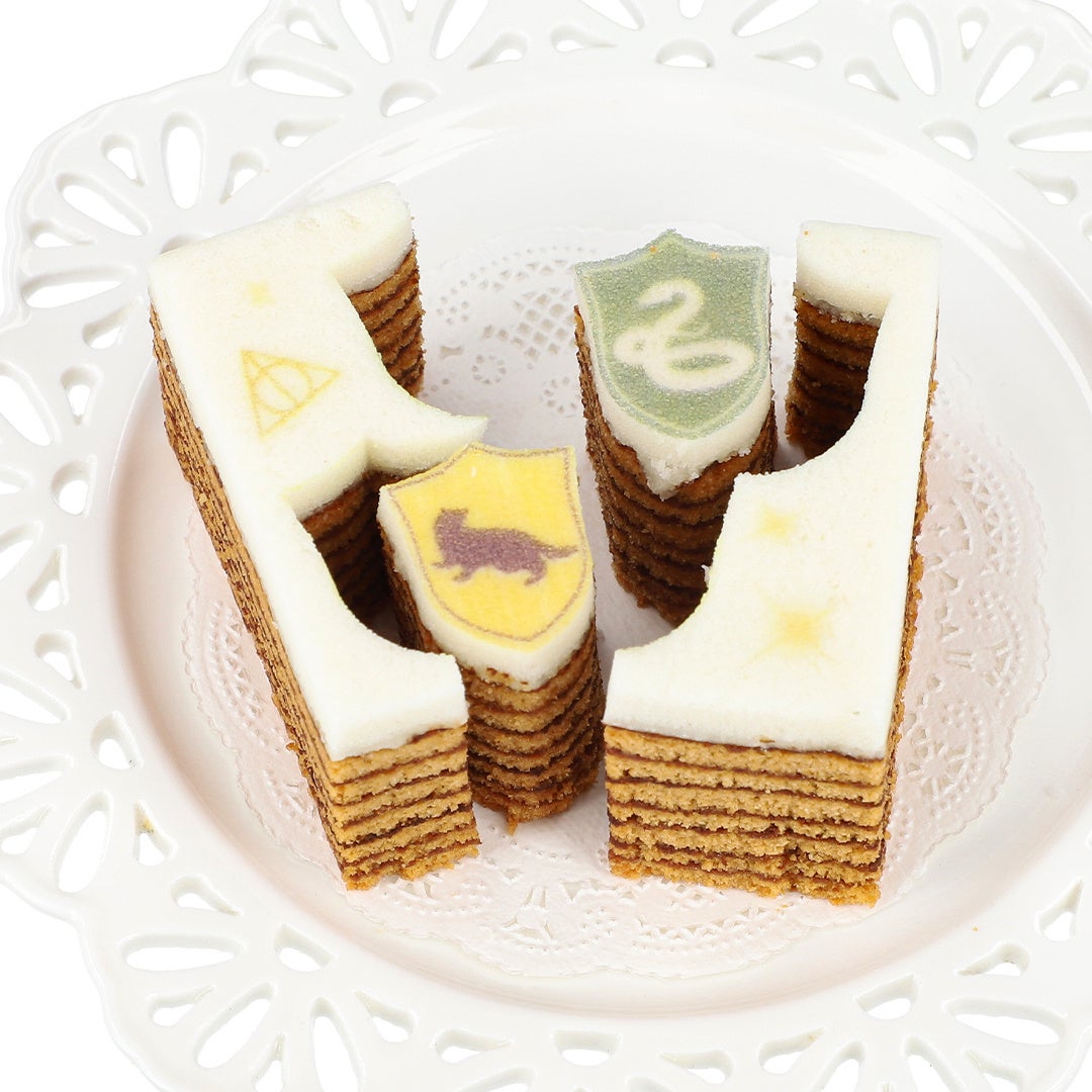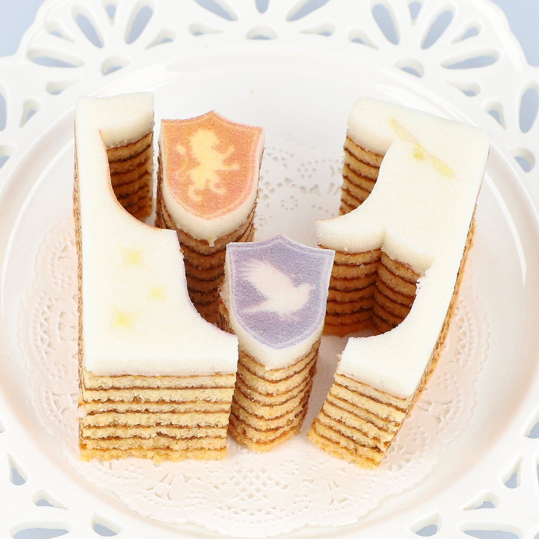 何層にも重なったバウムクーヘンはその名の通り、まるで年輪のようです。上部の真っ白な生地をキャンバスに見立て、タイムターナーと、グリフィンドール / スリザリン / レイブンクロー / ハッフルパフのプリントとカットがほどこされています。型抜きを楽しみながらおいしくお召し上がりいただけます。プレーン・いちご・キャラメルの3つの味がセットになっています。