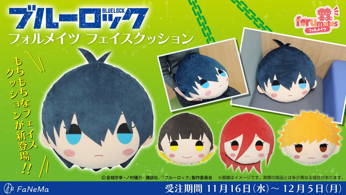 10月より放送中のTVアニメ『ブルーロック』より、潔 世一、蜂楽 廻、千切豹馬、國神練介が、デフォルメデザインが可愛い「フォルメイツフェイスクッション」になりました。