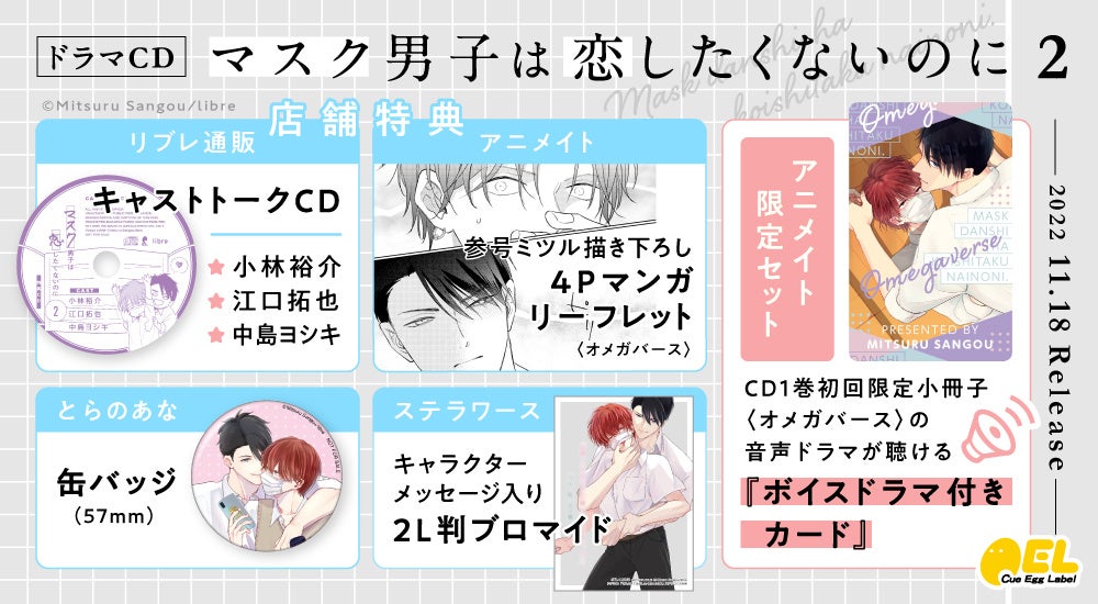 株式会社リブレ(本社:東京都新宿区、代表取締役社長:太田歳子)は、2022年11月18日にドラマCD「マスク男子は恋したくないのに2」をCue Egg Labelより発売いたします。https://www.b-boy.jp/special/masukudanshi/cd/